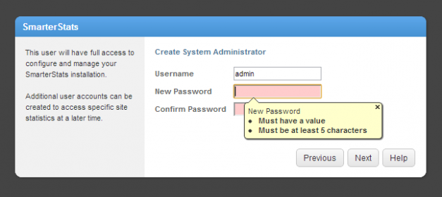 In my example, I am deciding to run SmarterStats as the free edition. After clicking Next, the Create System Administrator screen is shown: