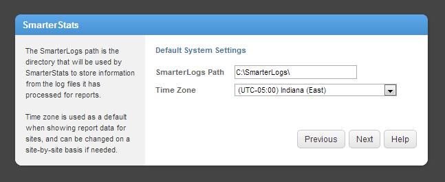 The SmarterLogs Path shown is the default, and quite honestly my preference. This path is important when troubleshooting issues to a specific site. The Time Zone setting seems to load based on the local time, and can be changed later on. I believe we also get the option to set this different per site. Our final screen is the Default SMTP Settings screen. Here you can configure how SmarterStats sends email messages. I usually think of this in terms of reports,standard and custom. This can be configured after the setup is complete as well. Once ready click Finish. This article will be updated with links to specific tasks.